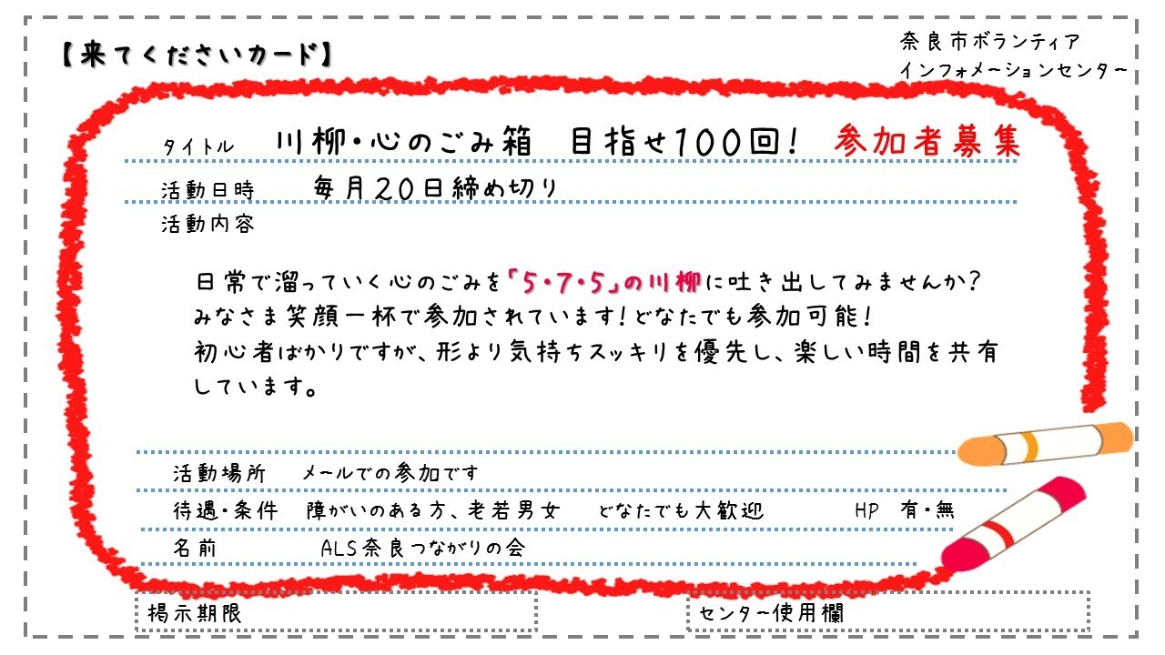 「来てください」カード ■他の「来てください」カードもご覧になられたい方は、当センターに掲示しておりますのでお越しください。■ボランティアに行きたい方、またはご興味・ご質問のある方は当センターまでご連絡ください。■「来てください」カードを掲載(掲示)されたい方は、当センター窓口までお越しください。