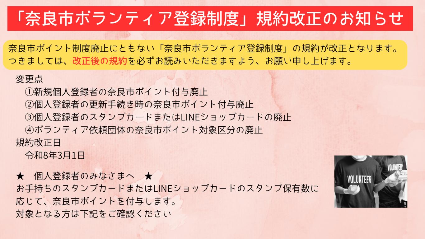 それにともない「奈良市ボランティア登録制度」も一部規約を改正いたします。